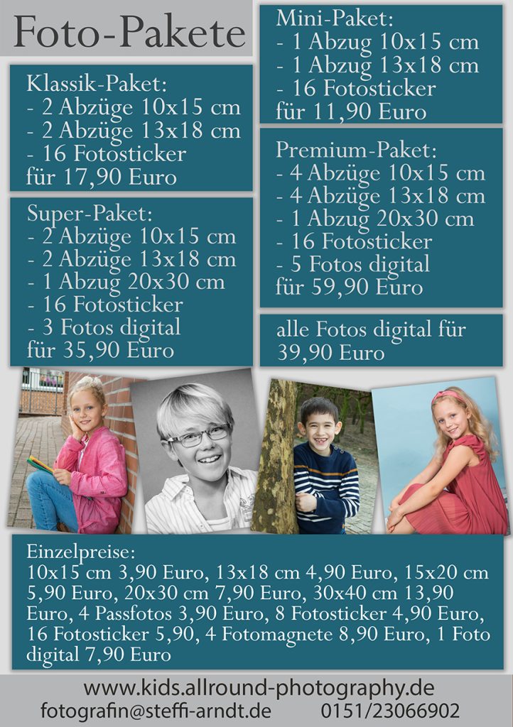 Ich biete verschiedene Sparpakete an, mit Fotoabzügen und auch als Download. Zudem können Fotos auch einzeln bestellt werden. So ist für jeden Geldbeutel etwas dabei. Die Pakete können frei zusammen gestellt werden. Bezahlen können die Eltern per Paypal oder Banküberweisung. Fotoabzüge werden dann per Post nach Hause geschickt.
