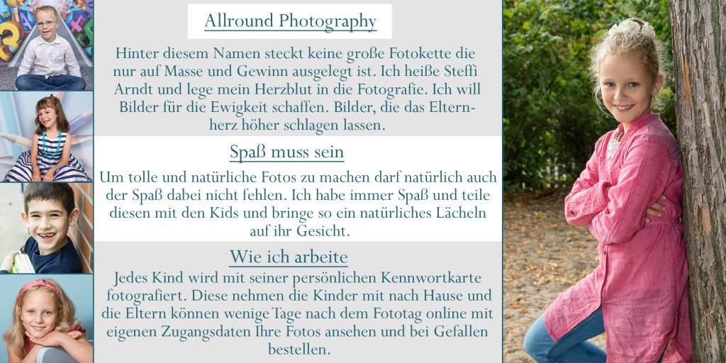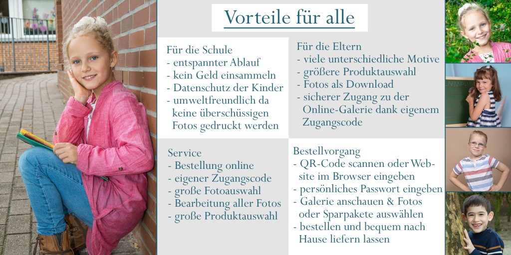 Seit vielen Jahren bin ich nun als Fotografin unterwegs und habe immer tolles Feedback bekommen, auch in Grundschulen. Mir ist es wichtig nicht nur alle Kinder schnell durch zu fotografieren, ich möchte von jedem Kind tolle Fotos machen, natürliche Fotos und ein echtes Lachen herauskitzeln. Meine Preise versuche ich immer so erschwinglich wie möglich für die Eltern zu halten. Für die Schule entstehen keine Kosten. Auch lästiges Geld einsammeln ist Schnee von Gestern. Die komplette Abwicklung läuft online. Jeder Schüler erhält einen persönlichen Zugangscode über den die Fotos bequem online angesehen und bestellt werden können.
