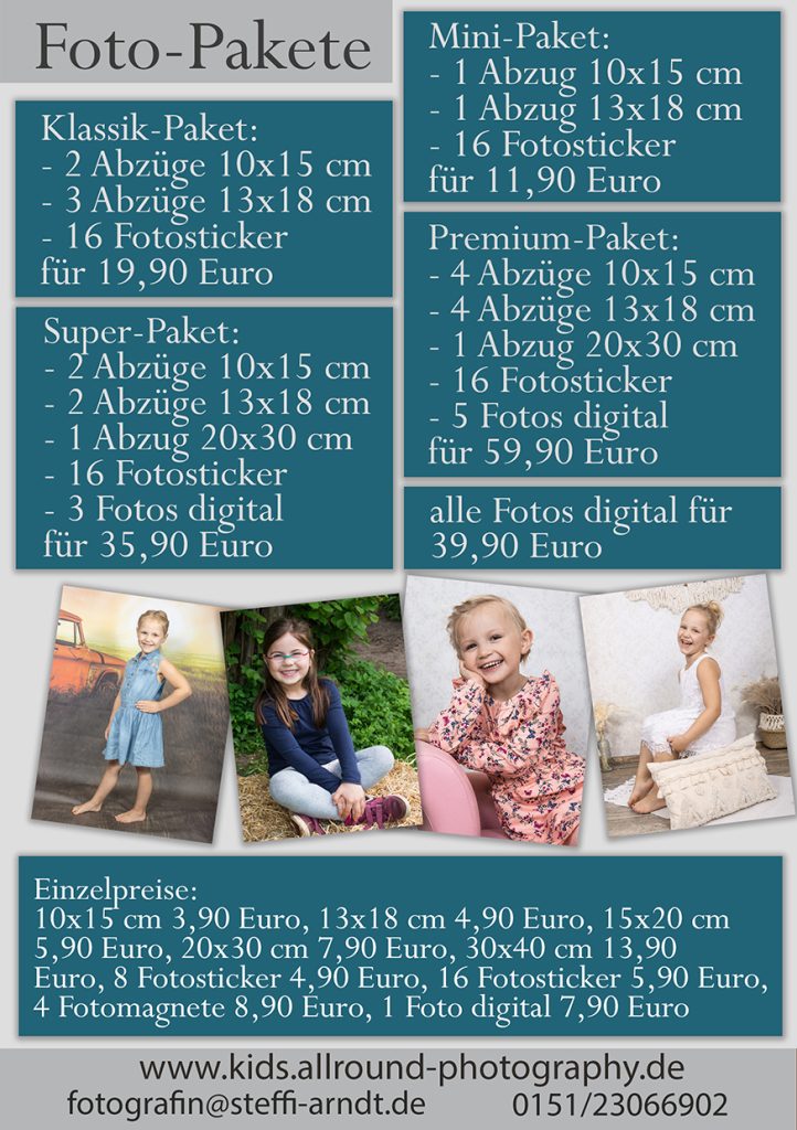 Zudem biete ich auch an Geschwisterfotos zu machen. Hierfür gelten die gleichen Preise. Optimal ist es für die Geschwisterfotos eine Liste mit Terminen auszuhängen, in der sich die Eltern eintragen können. So vermeiden wir lange Wartezeiten.