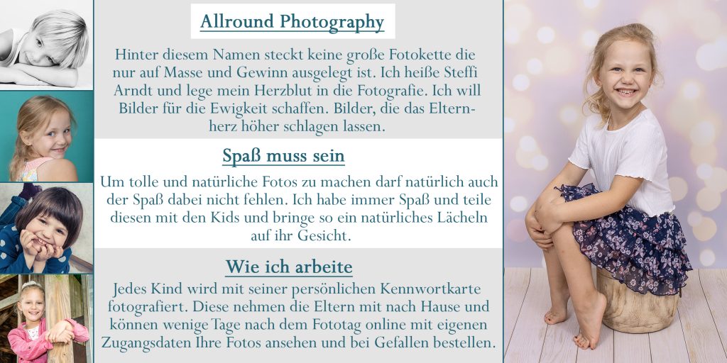 Seit vielen Jahren fotografiere ich in etlichen Kindergärten und habe immer tolles Feedback bekommen. Mir ist es wichtig nicht nur alle Kinder schnell durch zu fotografieren, ich möchte von jedem Kind tolle Fotos machen, natürliche Fotos und ein echtes Lachen herauskitzeln. Quatsch machen ist dabei an der Tagesordnung. Und auch meine Helferlein „Krümelmonster“ und „Ernie“ helfen mir oft dabei. Meine Preise versuche ich immer so erschwinglich wie möglich für die Eltern zu halten. Für die Einrichtung entstehen keine Kosten. Auch lästiges Geld einsammeln ist Schnee von Gestern. Die komplette Abwicklung läuft online. Die Eltern bekommen einen persönlichen Zugangscode für Ihre Fotos und können die Fotos bequem online bestellen.