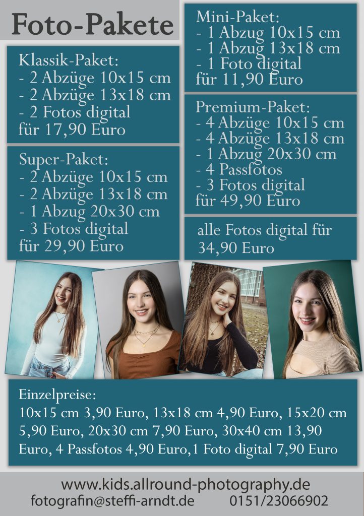 Ich biete verschiedene Sparpakete an, mit Fotoabzügen und auch als Download. Zudem können Fotos auch einzeln bestellt werden. So ist für jeden Geldbeutel etwas dabei. Die Pakete können frei zusammen gestellt werden. Bezahlen können die Eltern per Paypal oder Banküberweisung. Fotoabzüge werden dann per Post nach Hause geschickt.