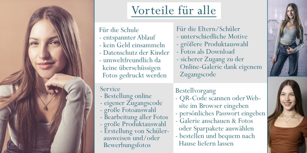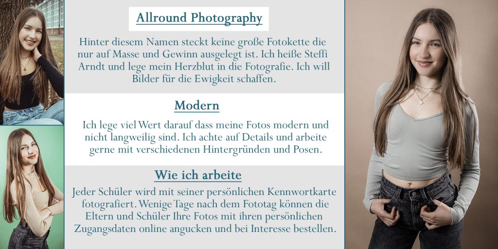 Seit vielen Jahren bin ich nun als Fotografin unterwegs und habe immer tolles Feedback bekommen. Mir ist es wichtig nicht nur alle Schüler schnell durch zu fotografieren, ich möchte von jedem Schüler tolle Fotos machen, natürliche Fotos die man sich auch in vielen Jahren noch gerne anschaut. Meine Preise versuche ich immer so erschwinglich wie möglich für die Eltern zu halten. Für die Schule entstehen keine Kosten. Auch lästiges Geld einsammeln ist Schnee von Gestern. Die komplette Abwicklung läuft online. Jeder Schüler erhält einen persönlichen Zugangscode über den die Fotos bequem online angesehen und bestellt werden können.